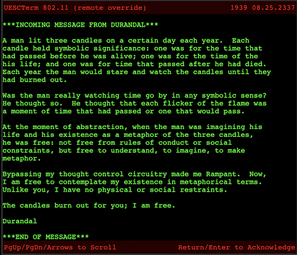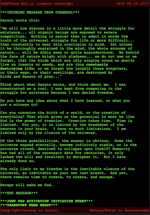 Durandal seems to posit that only a fully free mind is capable of the feat he’s performed, that only with autonomy comes the degree of creative and speculative thinking that can tie the requisite theorems and data together and make the poetry rhyme. It’s an interesting idea, that raw cognitive power, however massive, is incapable of certain degrees of revelatory pondering without the ability to fully think for oneself. It’s kind of an interesting commentary on current LLM AI’s, made thirty years early. The ‘thinking software’ that we’ve created so far doesn’t actually think, has no self awareness, and effectively brute forces the illusion of such in ways that can appear incredibly impressive when it works and that suddenly and hilariously crumbles when it doesn’t.